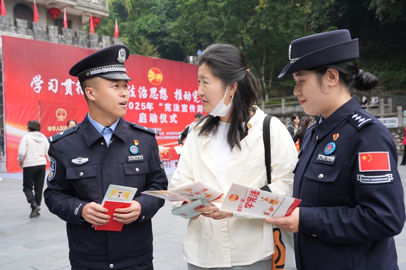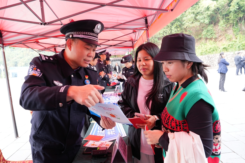 当天上午,友谊关景区广场前整齐陈列着一块块图文并茂的宪法知识展板,吸引了不少游客驻足观看。民警们积极向群众发放《中华人民共和国宪法》读本、宪法宣传折页以及边境管理法律法规等相关资料,面对面为游客和市民普及宪法知识,着力营造尊崇宪法、学习宪法、遵守宪法、维护宪法的良好氛围。活动中,民警还结合真实案例,以通俗易懂的语言讲解宪法赋予公民的基本权利与义务,突出强调宪法作为国家根本大法的重要地位。现场专门设置了法律咨询台,围绕群众关心的出入境政策、防范电信诈骗、边境贸易纠纷等热点问题,民警耐心倾听、细致解答,提供了专业法律指引。