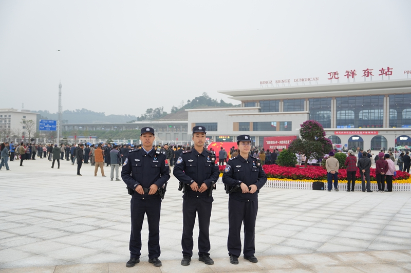 安保期间,大队依托“联勤联动”机制,联合铁路派出所等单位成立专项安保专班,在凭祥东站广场及周边区域启动“网格化步巡+无人机巡控”立体防控体系,全面提升区域见警率与管控力。通过“定点值守+动态巡查”相结合的方式,重点加强对站前入口、广场等人流密集区域的警力部署,让闪烁的警灯成为群众眼中可见的安全信号。同时,现场设置移动指挥岗,依托智能终端实时监测各区域人流动态,实现指挥调度与一线警力的无缝对接,确保各类突发情况第一时间响应、高效处置。