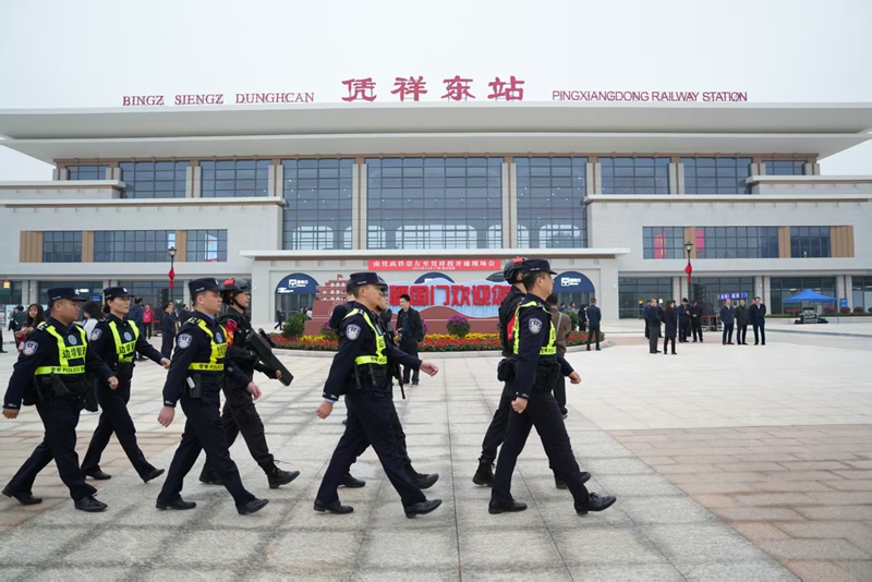 12月5日上午,南宁至凭祥高速铁路开通仪式在凭祥东站隆重举行。随着首趟D9668次列车准点发车,凭祥正式步入高铁时代。广西崇左边境管理支队凭祥边境管理大队全程投入安保护航,通过严密巡逻防控与暖心便民服务,为开通仪式构筑起坚实的安全屏障。