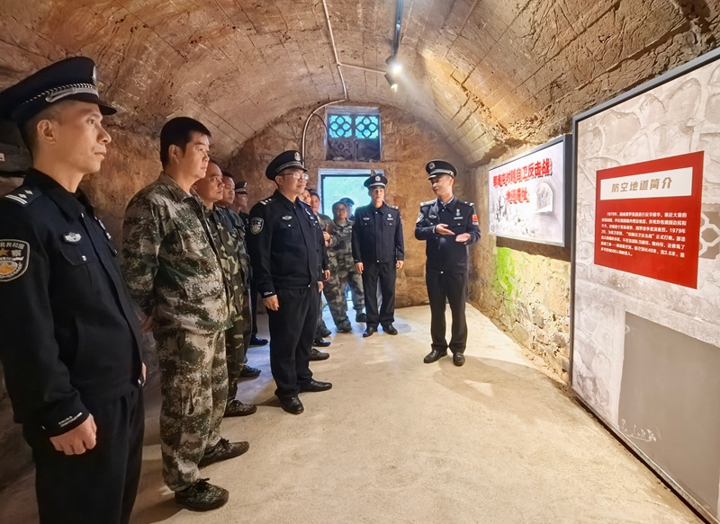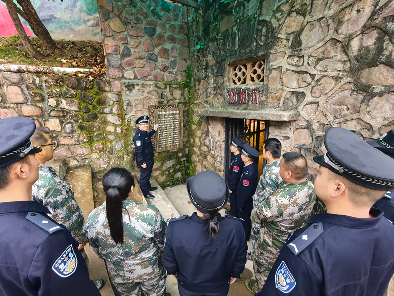 那逢屯作为中越边境线上的抵边屯,曾因军民联防、英勇抗敌被誉为“八十年代高家庄”,境内保存完好的防炮洞遗址、边关哨所与村史馆,承载着边疆儿女保家卫国的峥嵘记忆。党员们循着历史足迹,在斑驳的防炮洞前感受战火岁月的坚守,在村史馆的实物史料前重温军民同心守边的壮阔历程。“爷爷组建民兵小分队挖地道护家园,伯伯支前立功传家风,我守边18年巡边5000多公里,是屯里护边队的主要负责人……”护边员潘武文结合自身经历,深情讲述一家三代接力守边的故事,从父辈挎枪巡边到如今联防护边,从抗击侵略到产业兴边,三代人的坚守诠释了“一生只为守边疆”的赤诚,让在场警地党员深受触动。