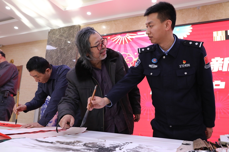 活动现场气氛热烈,民警们簇拥在书画名家周围,认真观摩创作过程,细细品味作品意境,并不时与艺术家们交流心得。书画家们还围绕书法绘画的基本技法、艺术鉴赏等内容与民警开展互动,在一笔一画的示范中传播传统文化精髓。部分有书画爱好的民警也提笔尝试,在艺术家指导下完成属于自己的迎新作品。