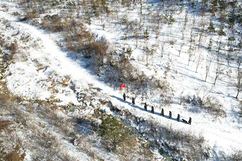 你拉我一下、我推你一把,民警们在山间冰河上相互配合,一步一呲溜地向目的地前进。一路上,巡逻队伍对周边山林的独立房屋、界江干流封冻段等边境重点区域进行踏查巡防。据曲光磊介绍,“新年第一巡”和日常巡边是有差别的,通常会采取所站联合巡边,巡逻人数更多、路线更长,仪式感拉满。