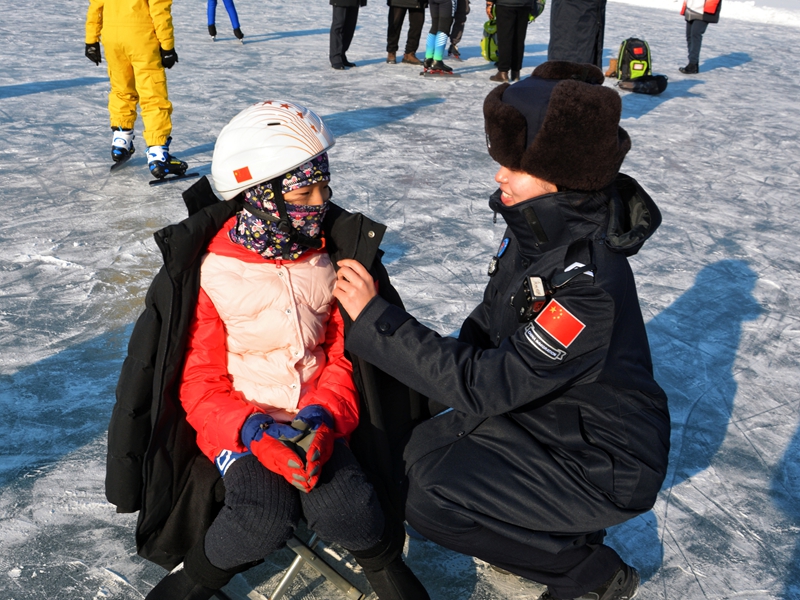 赛事期间,临城边境派出所启动“网格布警、动态巡控” 一体化勤务模式,在赛场出入口、核心竞赛区、观众聚集区及界江邻近区域科学部署警力,民警顶着零下20℃的凛冽寒风坚守岗位,有序引导人流车流,及时劝阻危险行为,同步开展边境管控巡查,严防无关人员靠近边境管控区域。同时,执勤民警主动延伸服务与普法触角,化身“边境法治宣传员”与“暖心服务员”——为老年观众提供入场引导与座位指引、协助参赛选手规范存放参赛装备、为有需要的群众提供热水与应急药品、快速帮助2名走失儿童找到家长;更抓住赛事人流集中的有利时机,通过发放边境法规宣传手册、现场解读核心条款、解答群众咨询等方式,重点宣传《陆地国界法》中关于禁止非法越界、保护边境设施、规范边境活动等核心内容,结合《吉林省边境管理条例》解读边境地区生产生活、文体活动的法律边界,提醒群众在观赛休闲之余严守边境法规,远离界江危险区域,累计发放边境法规宣传资料1500余份,解答群众咨询30余人次,让“守边境、学法律、保安全”的理念随冰雪运动热潮深入人心。