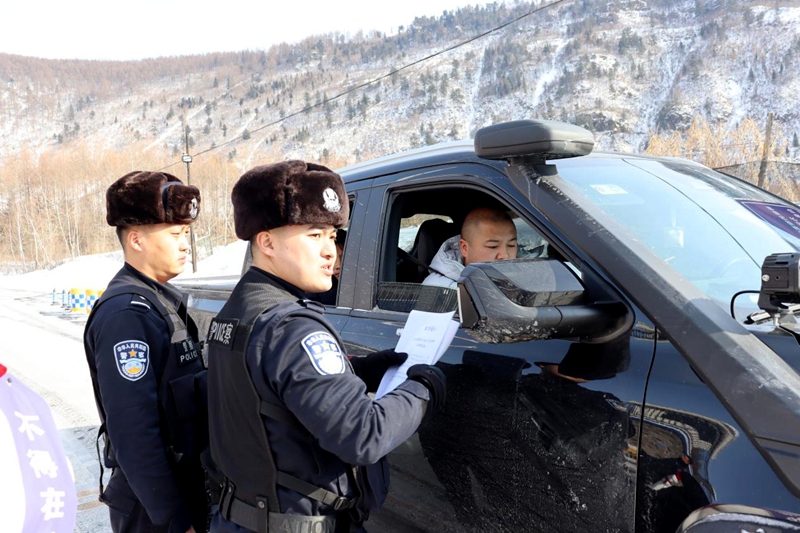 “前方积雪较深,减速跟车!”途中,民警驾驶警车开启护航,以“前车护送、全程管控”模式引导车队前行。零下20摄氏度的严寒中,民警坚守岗位,实时观察路面情况,全力保障车队通行。与此同时,检查站还开通文旅车队专属绿色通道,优化查验流程,实行“专人引导、集中查验、快速放行”模式,缩短车辆停留时间,最大限度加强游客游玩体验度。