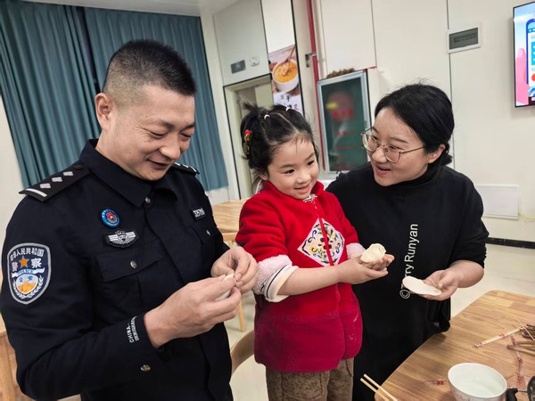食堂内暖意融融,揉面、擀皮、调馅、包饺子,大家围站桌前,手法娴熟、笑语不断。民警与家属互相切磋技艺,有的包出圆润饱满的“元宝饺”,有的捏出别致精巧的“月牙饺”,孩子们也踮起脚尖参与其中,小手沾满面粉,童趣十足。另一边,粽叶翻飞、糯米飘香,大家围坐一起折粽叶、填馅料、绑棉线,包出一个个棱角分明的粽子,将平安祝福与思乡之情裹进清香粽叶。欢声笑语盖过锅碗瓢盆的碰撞声,鲜香气息弥漫整个营区,让坚守边关的民辅警真切感受到“家”的温暖。