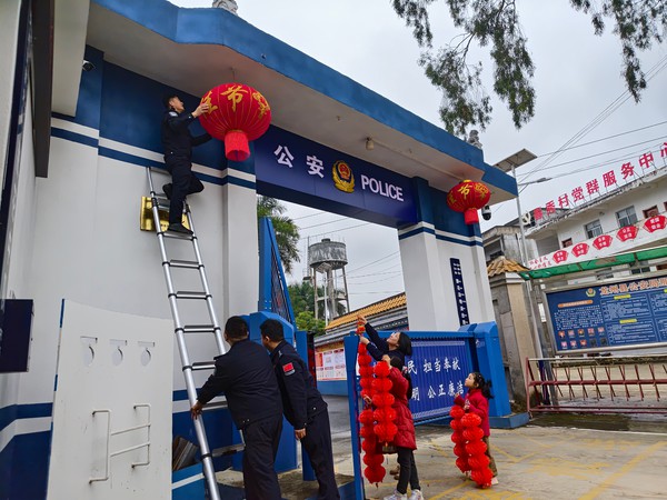 营区内外,挂灯笼、贴福字、布置新春装饰同步进行。民辅警与家属携手搭梯、悬挂、固定,一盏盏红灯笼次第点亮,映照出一张张幸福笑脸。警宝们穿梭其间,好奇地触摸灯笼、追逐嬉戏,为警营增添了无限生机与活力。大家在忙碌中增进感情,在协作中凝聚力量,用最朴素的方式装点属于边境民警的“团圆年”。