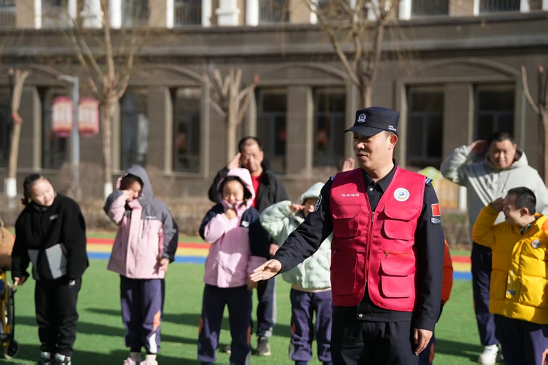 福利院的孩子们大多身体残疾或智力发育存在一定欠缺,平日里更需要耐心陪伴与细致呵护。活动中,民警们并没有简单走访慰问,而是俯下身子、放慢脚步,用温柔耐心的态度与孩子们亲密互动。标准化队列展示庄重有序,民警们昂扬挺拔的身姿,让孩子们眼中充满好奇与敬佩。