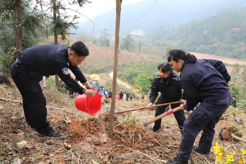 活动中,宁明边境管理大队主动对接宁明县林业局、团县委、爱店镇政府、桐棉镇政府及边境村屯干部群众,组建多支“戍边志愿植树队”,分赴多个植树点开展义务植树。在派阳山森林公园主会场,民辅警与驻地单位代表、青年志愿者分工协作、默契配合,挥锹铲土、扶苗填坑、提水浇灌,合力栽下一株株象征忠诚与守护的“戍边树”。在边境一线执勤点,民辅警利用勤务间隙,与周边群众一起在荒坡空地见缝插绿、植绿补绿,既美化营区环境,又起到固土护坡、涵养水源的生态防护作用。此次系列活动累计栽植沉香、秋枫、黄槐、桃花、星油藤等适生苗木1500余株,绿化面积近10亩。