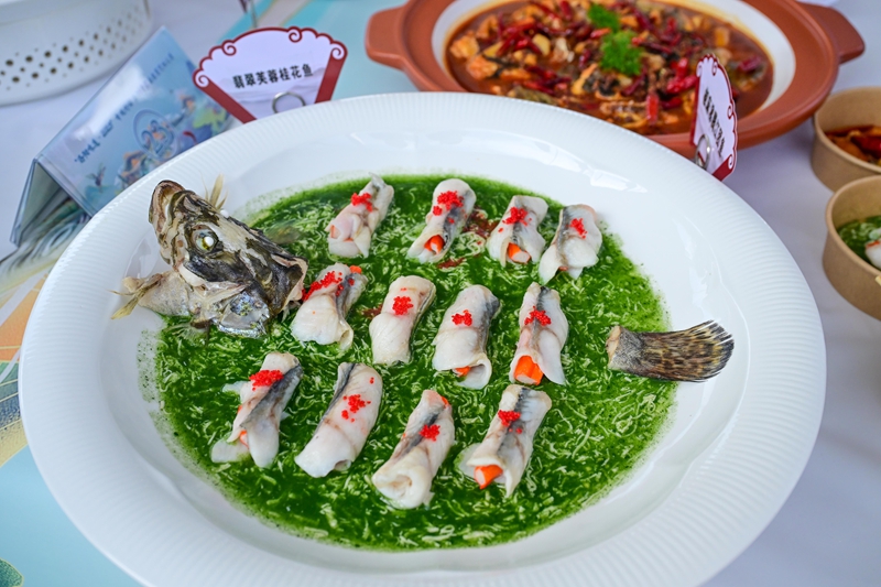 来自汝阳瑞云国际大酒店的主厨李行行则推出富有诗意的菜品“一叶浮萍”。在一只小瓷盅里,莲蓬与莲藕漂浮在清汤中。据李行行介绍,莲藕是竹笙包裹鱼蓉做成,而莲蓬则是鱼糕加入菠菜汁,造型成莲蓬后再嵌入青豆。“这道菜不仅造型精美,更体现了‘鱼文化’的诗意之美。”李行行说。