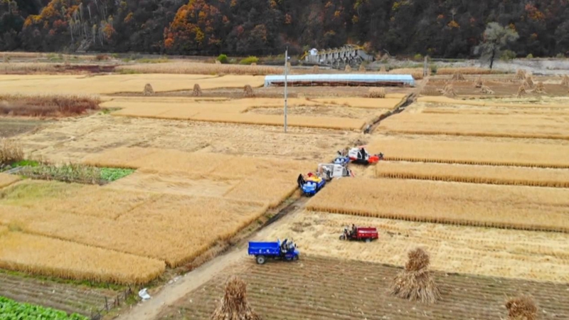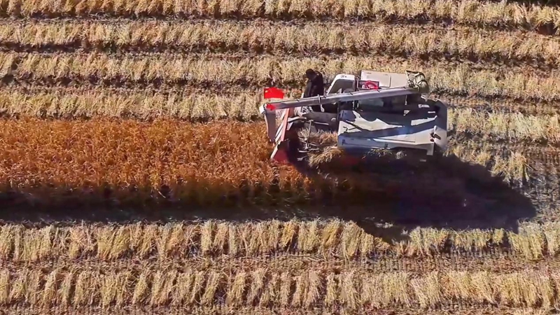 秋高气爽,水稻已陆续成熟,迎来了丰收的季节。在吉林省临江市蚂蚁河乡贾家营村的水稻田里呈现出一片繁忙景象,收割机在田间来回穿梭,忙碌地进行水稻收割作业。