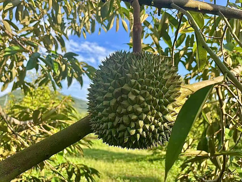 4月,海南省万宁市南桥镇榴莲种植基地里,榴莲树长势良好,在风调雨顺的条件下,今年预计总产量达10万斤,将于7月全面上市。