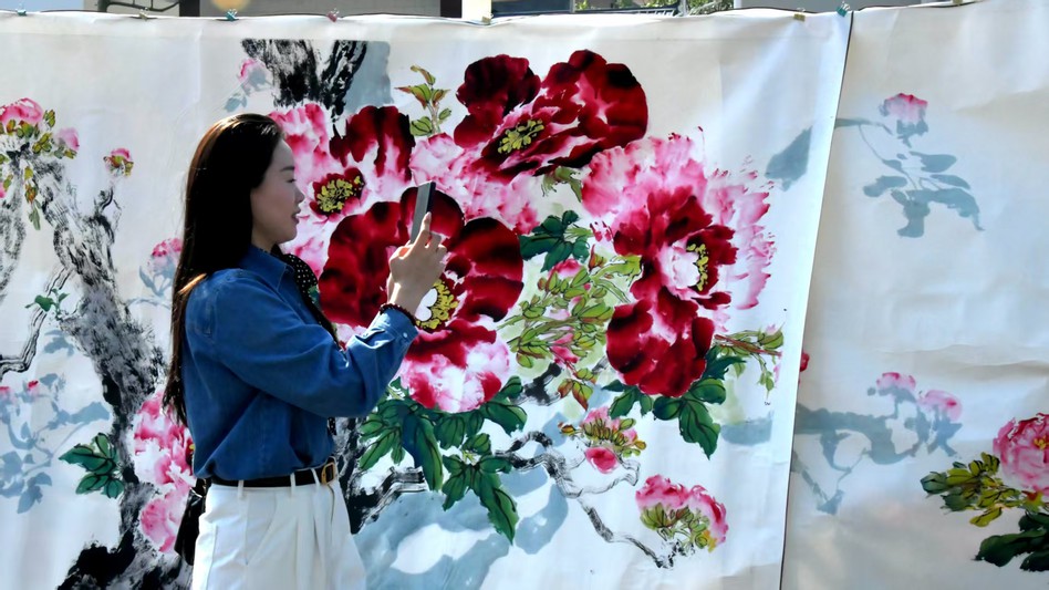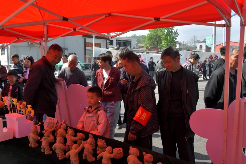 活动现场,悬挂嵩县籍画家张志文牡丹长卷的无人机缓缓升空,引人注目;烙画、葫芦画、剪纸、泥塑等组成的非遗文化市集,摊位前人头攒动;碧波荡漾的湖水、静谧古朴的村落与艺术气息浓厚的牡丹画交相辉映,交织成一幅诗意画卷,令人惊叹。
