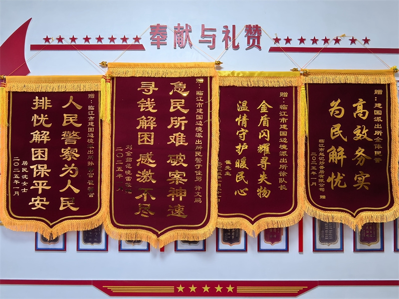 在迎接2025年新春佳节之际,白山边境管理支队建国边境派出所内洋溢着浓厚的喜庆氛围,这里接连收到了四面承载着群众浓厚情谊的锦旗。每一面锦旗背后,都凝聚着一个动人的故事,都表达了群众对派出所民警工作的认可和感激。
