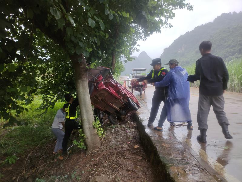 板化边境检查站民警紧急救援因台风发生侧翻的农用三轮车