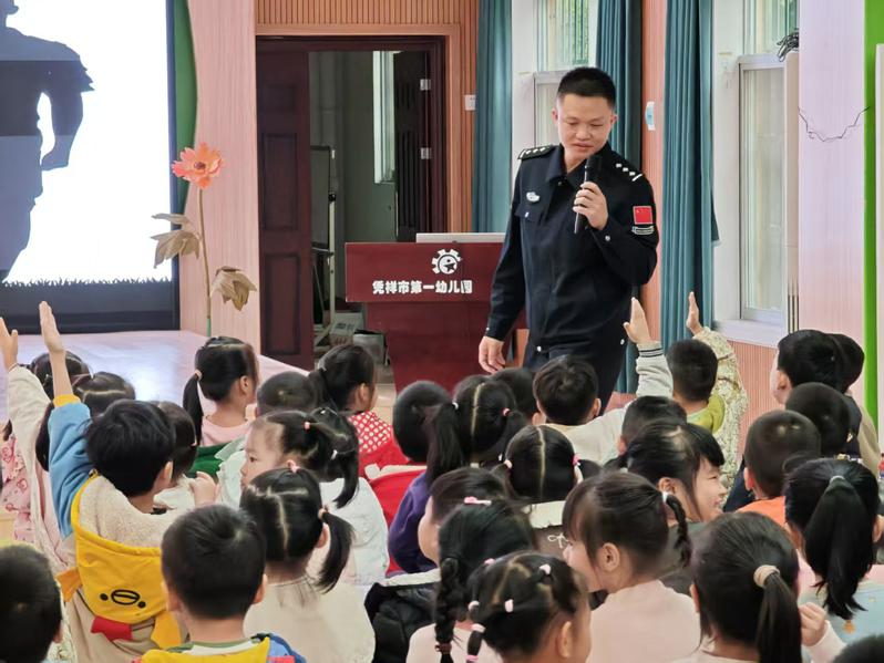 为提升幼儿安全防范与自我保护能力,近日,广西崇左边境管理支队凭祥边境派出所民警走进凭祥市辖区3所幼儿园,开展“安全伴成长,守护不缺位”主题教育活动,通过情景互动、实战演练等方式,向幼儿传授防拐骗和防震减灾等知识。