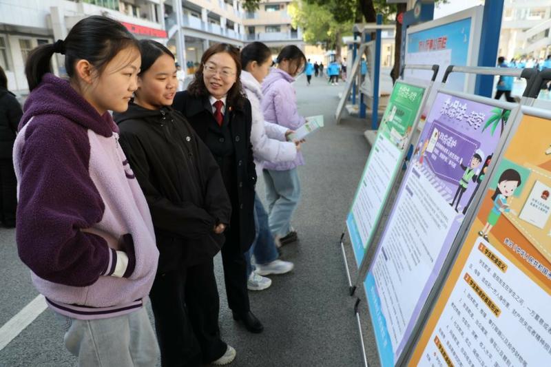 活动现场还设置了宪法知识展板区,发放了图文并茂的法治宣传手册,营造出浓厚的法治文化氛围。黄州区检察院检委会专职委员、西湖中学法治副校长张艳芳现场解读宪法中关于未成年人权利义务的相关条款,进一步加深了学生们对宪法权威性与实践性的认识。她指出:“宪法不是冰冷的文字,而是有温度的守护者。它规范行为边界,也照亮前行道路。”