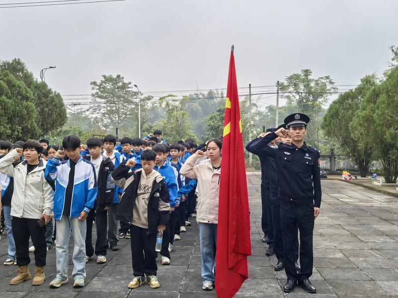 寒风凛冽,松柏苍翠,烈士陵园内气氛庄重。上午9时许,活动在庄严的国歌声中开始。民警代表与学校师生整齐列队,肃立于革命烈士纪念碑前。全体人员垂首默哀三分钟,深切悼念为国家和民族牺牲的英烈们,寄托无尽的哀思。默哀完毕,全体人员紧握右手成拳、举臂齐眉庄严宣誓,用铮铮誓言表达了对英烈的深切缅怀,将转化为履职尽责、练好本领的强大动力,为推进新时代广西边境地区长治久安和高质量发展、建设社会主义现代化新广西提供人才储备铆足动力。