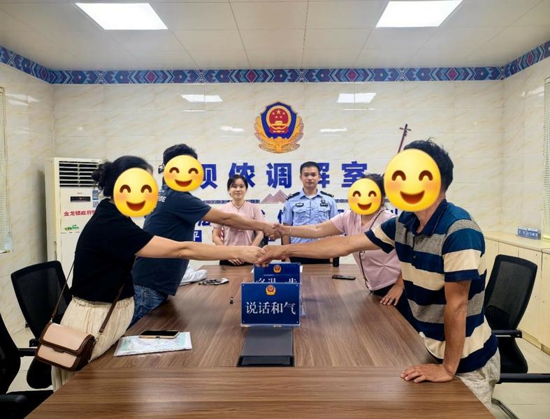 辖区大满屯沈氏姐弟曾因建房占用猪棚土地起争执,昔日和睦亲情因方寸之地闹得不可开交。依托“1+N”联调机制和“呗侬调解室”,民警严格践行“五心调解工作法”,联合司法调解员、村委干部第一时间介入:先是细心梳理纠纷脉络,掌握土地权属相关情况;再耐心拉着姐弟俩的手倾听诉求,说:“咱们都是壮族呗侬,血浓于水的亲情可比一块地金贵多了,有啥诉求慢慢说,咱们一起想办法”;随后以诚心搭建沟通平台,剖析矛盾根源,提出兼顾双方利益的解决方案;最终用暖心服务促成姐弟俩握手言和。事后,姐弟俩特意定制锦旗送到派出所,握着民警的手反复说:“多亏了你们这些‘贴心呗侬’,用真心帮我们保住了亲情!”