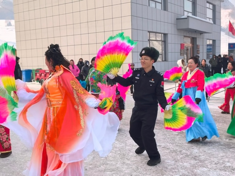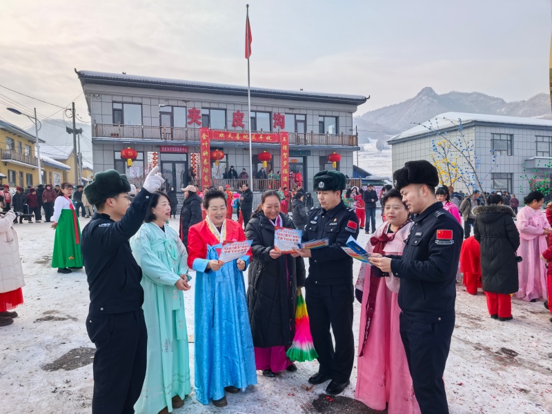 这边刚把冒着热气的杀猪菜端上桌,那边的大秧歌就扭起来了,民警们也被热情的村民拉进队伍,民警和村民共同组成的秧歌队踩着鼓点扭了起来。秧歌表演结束后,“流动普法小课堂”随即开讲,民警们用通俗易懂的语言,向现场群众讲解《治安管理处罚法》和《吉林省边境管理条例》等法律法规,并针对边境地区常见的矛盾纠纷、消防安全等问题进行答疑解惑,现场发放宣传资料200余份,解答群众咨询30余人次。