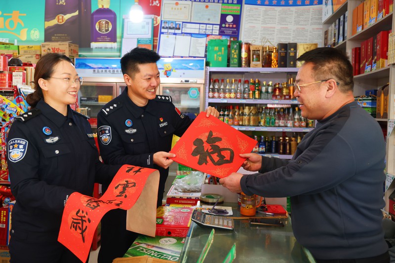 “李老板,新年好,给您送福了!”民警莫日根走进杂货店,亲手将福字贴在门框上,老板李五满脸感激。这份感激源于两个月前,李五的白色泰迪犬走失,情急之下报警求助,民警快速调取监控排查,很快帮他找回爱犬。莫日根笑着说:“找狗虽不是大事,但群众信任我们,这份寄托不容辜负,我们必须全力以赴!”随后,他检查店内消防隐患,叮嘱李五节前注意用电安全,共同守护好平安年。