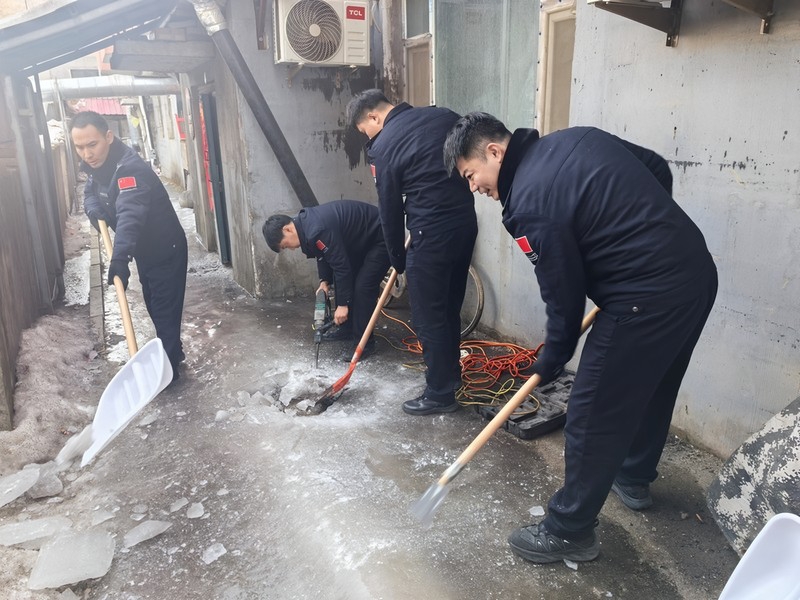 与前期大规模清雪不同,此次行动更具针对性。民警携带镐、铲等工具,重点对背阴路面、楼宇屋檐下、单元门口、坡道转弯处等阳光照射不足、容易形成暗冰和悬挂冰凌的区域进行彻底清理。民警们细心凿碎压实的地面冰层,用力铲除角落里的残冰积雪,并仔细敲打、清除屋檐上可能坠落的冰凌,防止其融化坠落伤人。随后,民警们深入辖区居民小区,特别是老旧小区和无物业管理小区,与社区工作人员、热心居民一道,对小区内部道路、停车场、活动广场等公共区域的残余冰雪进行“地毯式”清除。他们不仅清扫通道,还细心地在湿滑处铺设防滑垫、设置简易警示标志,并提醒过往居民,尤其是老人和儿童注意脚下安全。“检查站民警同志想得太周到了,把这些化不干净的冰碴子都清除了,我们出门遛弯、带孩子玩就放心多了!”辖区群众王阿姨称赞道。
